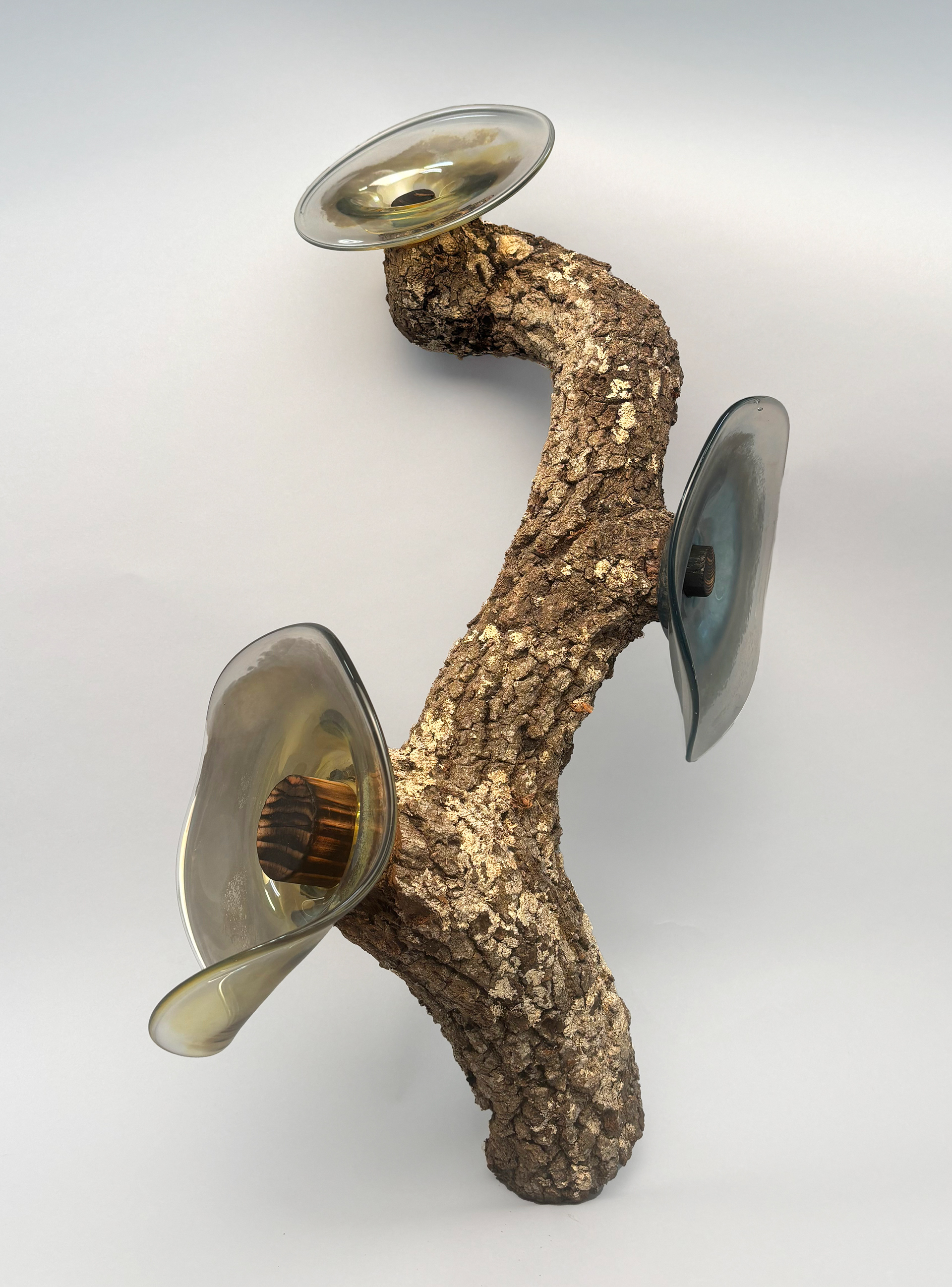Using glass to represent new life growing from old materials through themes of regeneration and transformation. The glass blooms from the decaying wood, speaking to life, death, and transformation.